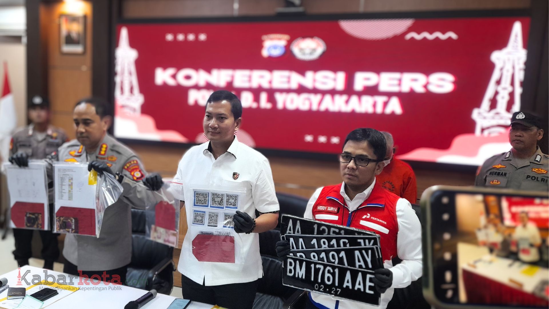 Polisi menunjukkan tersangka AM beserta barang buktinya di Mapolda DIY, pada Kamis (13/3/2025). (dok. kabarkota.com)