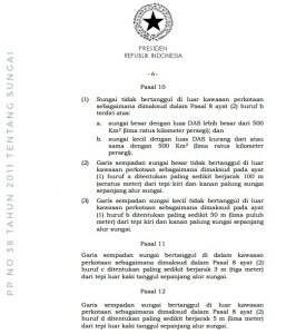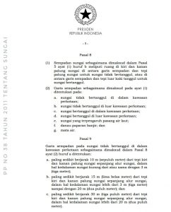 Batasan jarak sempadan sungai bertanggul maupun tak bertanggul, baik di perkotaan ataupun pedesaan, juga diatur di pasal 8 – 12 PP No 38 Tahun 2011 tersebut.